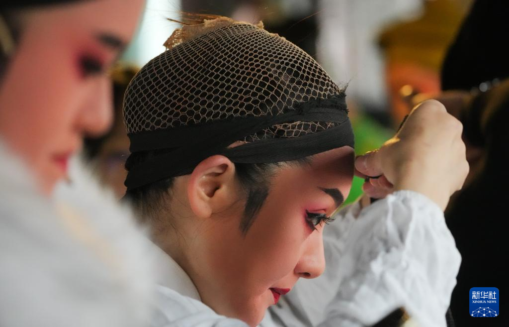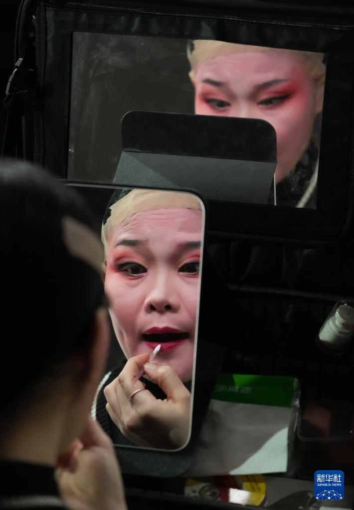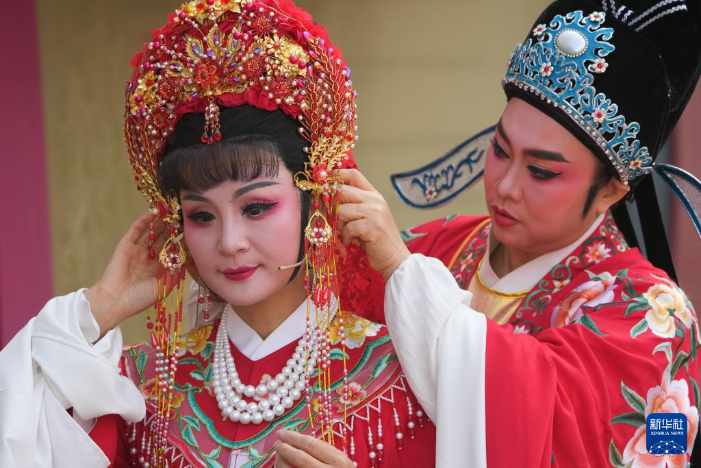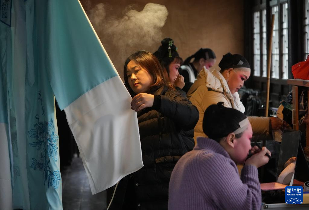 在(zai)紹興(xing)市(shi)柯橋區夏(xia)履鎮蓮增村,民間越劇團晶蕾藝術團成員在(zai)為(wei)表演越劇《五女拜(bai)壽》做準備(1月25日(ri)攝)。