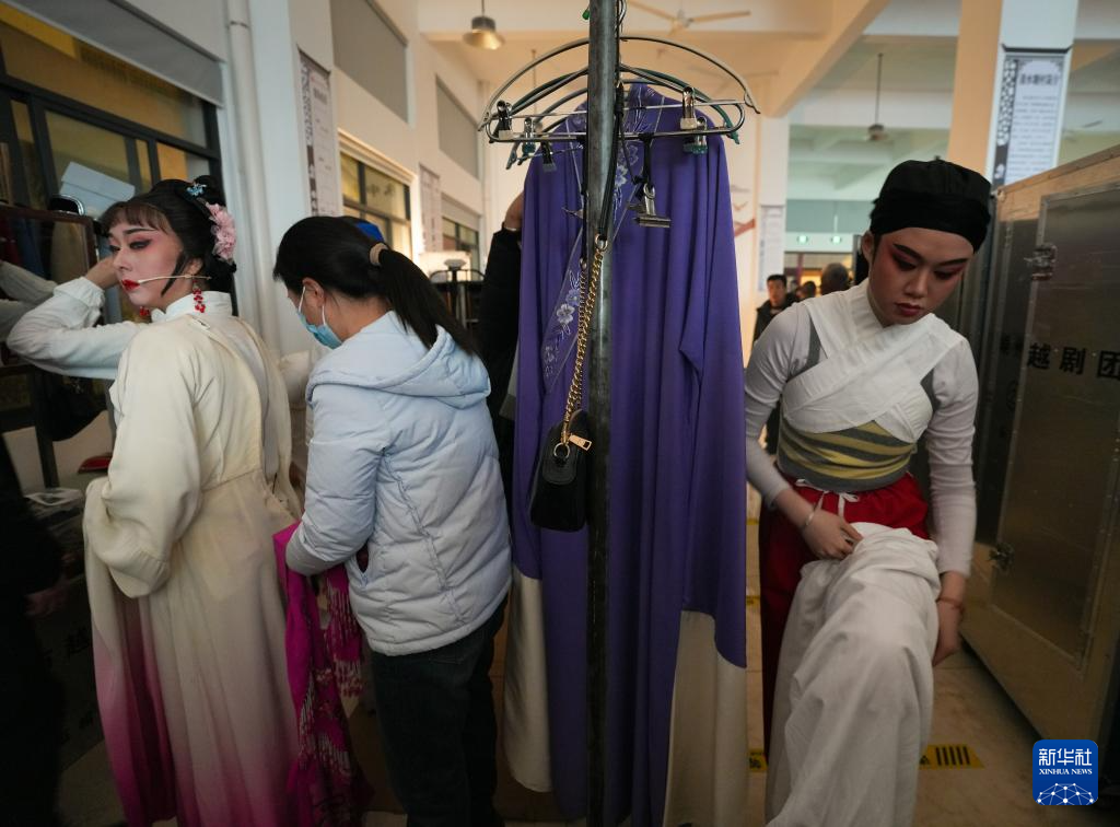 在(zai)浙江紹(shao)興嵊州市三界鎮清水(shui)塘村文(wen)化禮堂,下鄉(xiang)演出的嵊州市越(yue)劇團演員在(zai)臨時隔出的區(qu)域補妝、更衣(1月(yue)21日攝)。