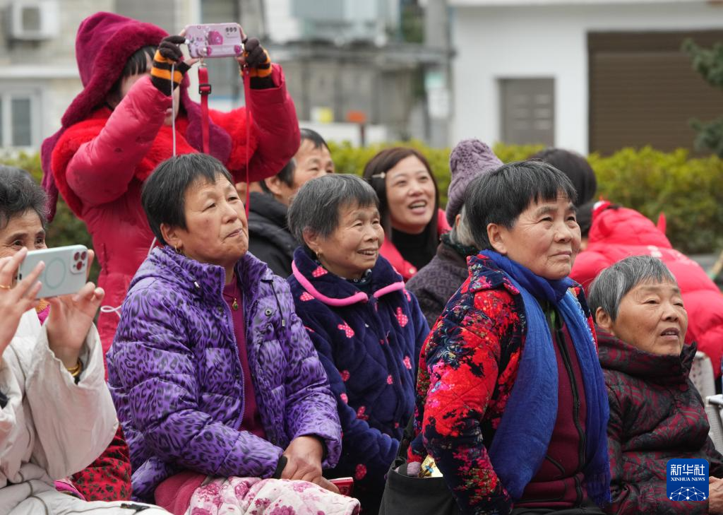 在紹興市(shi)嵊州市(shi)三界鎮清水塘(tang)村文(wen)化禮堂(tang),村民(min)在觀看嵊州市(shi)越劇團下鄉(xiang)演出的越劇《雙橋結(jie)親》(1月21日攝)。
