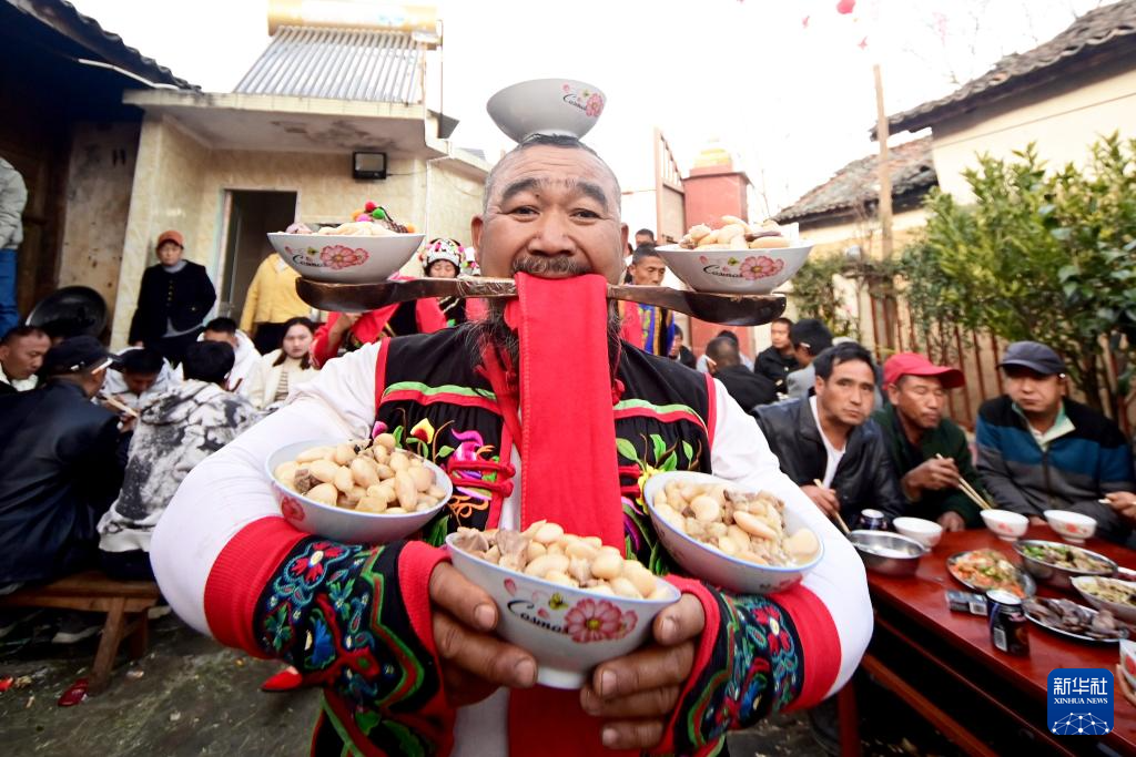 新春的云(yun)南省大(da)理(li)白族自治(zhi)州南澗彝族自治(zhi)縣(xian)熱鬧(nao)非凡。當地村民在火紅的燈(deng)籠(long)下(xia)擺(bai)開宴席,隨著(zhu)鑼鼓、嗩(suo)吶聲響起,跳菜表演者頭頂(ding)托盤、口咬桌角(jiao)、三翻(fan)三轉……在樂(le)聲中騰挪(nuo)跳躍,將彝家美食送上(shang)餐桌。