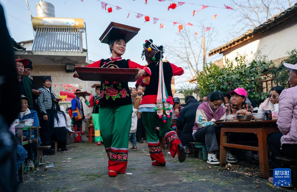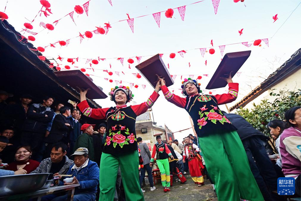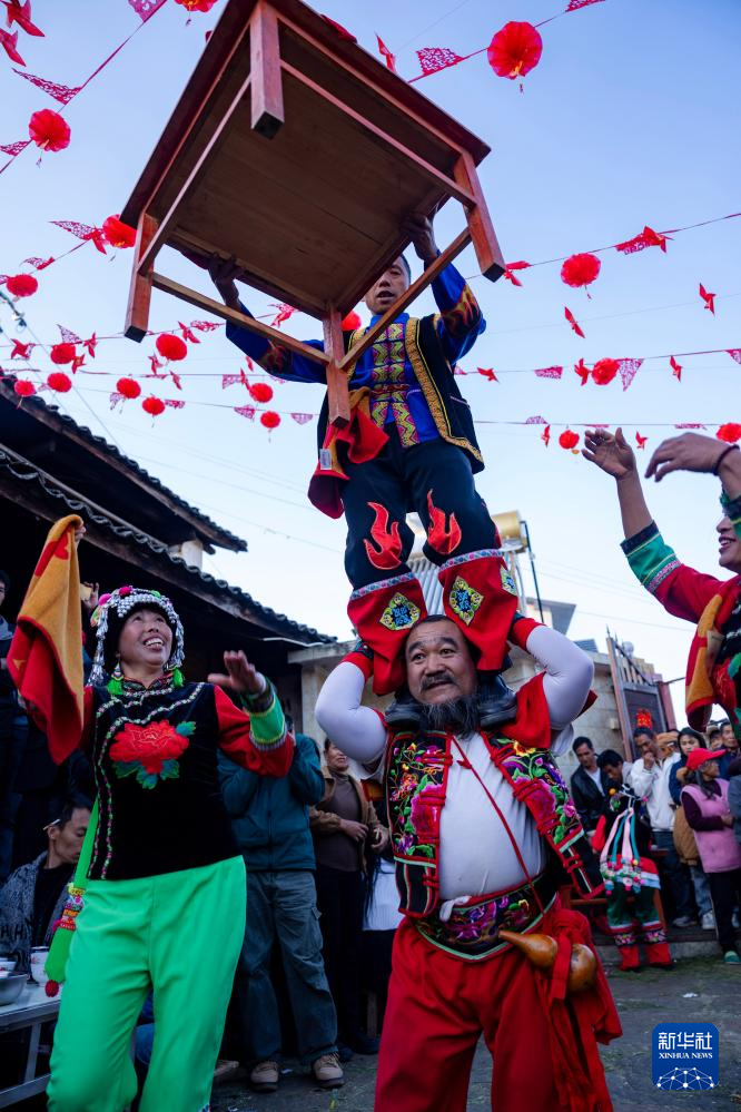 新春(chun)的云南省(sheng)大理(li)白族自治州南澗彝族自治縣熱鬧非凡(fan)。當地村民在(zai)火(huo)紅的燈籠(long)下擺開(kai)宴席,隨著鑼鼓、嗩吶聲響起(qi),跳菜表演者頭(tou)頂托盤、口咬桌角、三(san)翻三(san)轉……在(zai)樂(le)聲中(zhong)騰(teng)挪跳躍,將彝家美食(shi)送上餐桌。