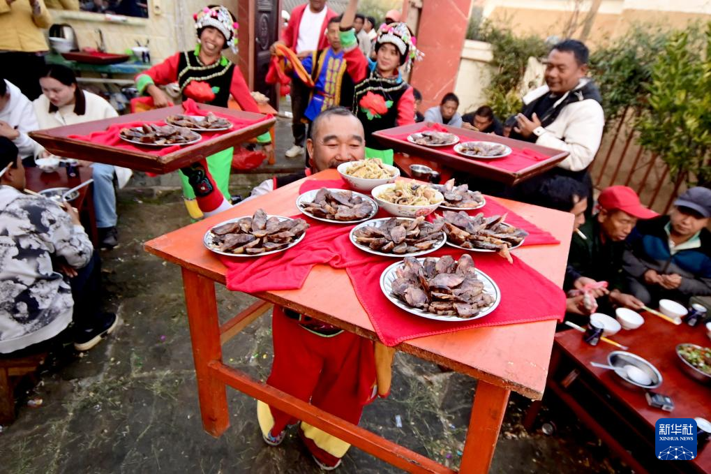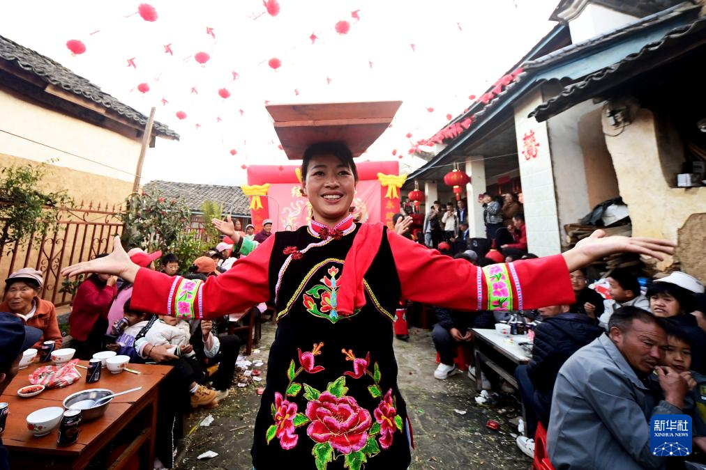 2月7日,跳菜表(biao)演(yan)者(zhe)在(zai)南(nan)澗縣寶華鎮擁(yong)政(zheng)村一(yi)農戶家的婚禮上表(biao)演(yan)。