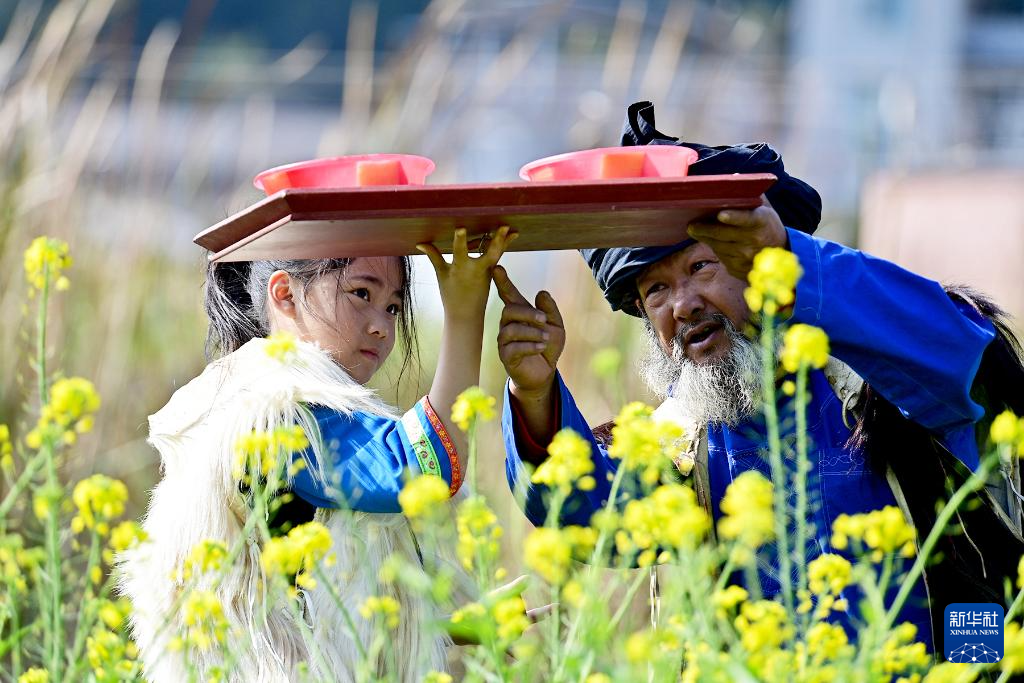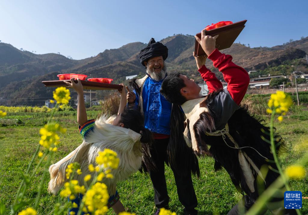 2月5日(ri),南澗(jian)彝族跳菜省級非物質文(wen)化遺產代表性傳承人阿本枝(zhi)(中(zhong))在給孫輩(bei)傳授跳菜技藝。