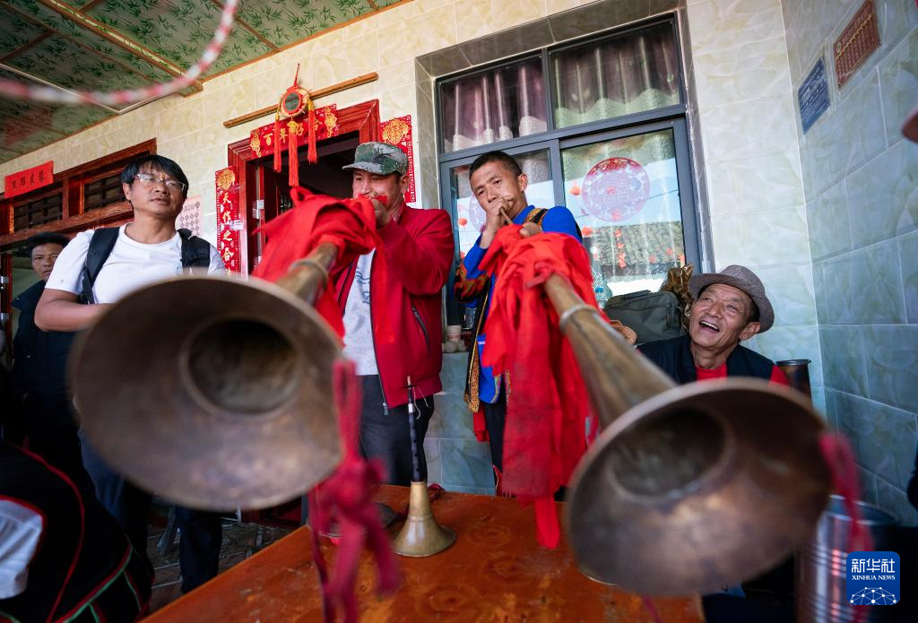 2月(yue)7日,樂(le)手在南澗縣寶華(hua)鎮擁政(zheng)村一農戶家的婚禮跳菜上(shang)吹奏樂(le)器。
