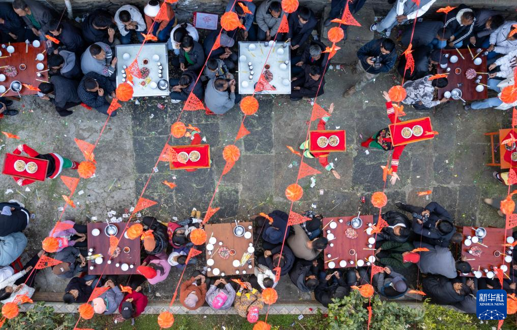 2月(yue)7日,跳(tiao)菜表演(yan)(yan)者在南澗縣(xian)寶華鎮擁(yong)政村一農(nong)戶(hu)家的婚禮(li)上表演(yan)(yan)(無人機照(zhao)片)。
