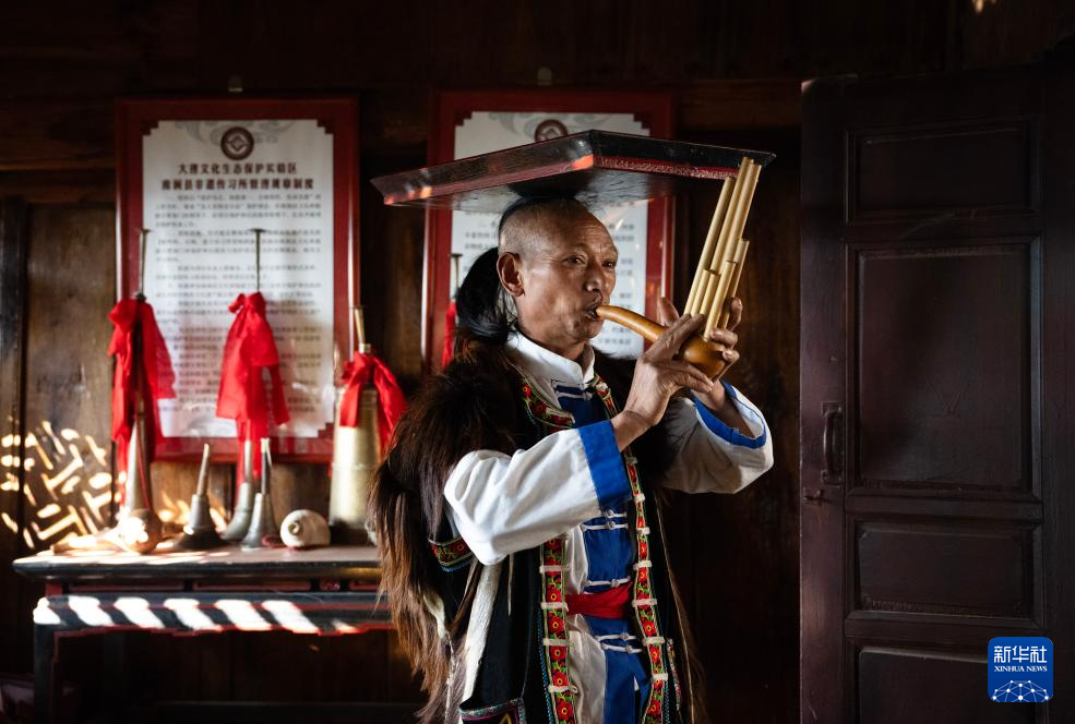 2月7日,南澗彝族跳菜國家級非物(wu)質(zhi)文化(hua)遺產代表性傳(chuan)承(cheng)人魯朝金在非遺傳(chuan)習所內演示跳菜技藝。