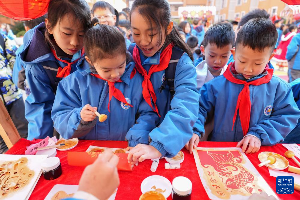2月9日,在(zai)(zai)長(chang)沙市仰天湖(hu)桂(gui)花坪小學,小朋友(you)在(zai)(zai)體驗拓印。