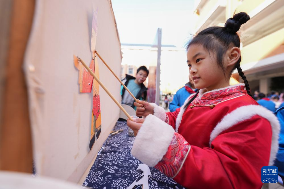 2月(yue)9日(ri),在長(chang)沙市(shi)仰天(tian)湖桂(gui)花坪小學,小朋(peng)友(you)在體(ti)驗表演皮影(ying)戲。