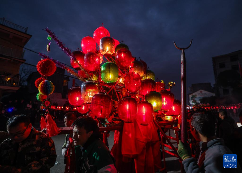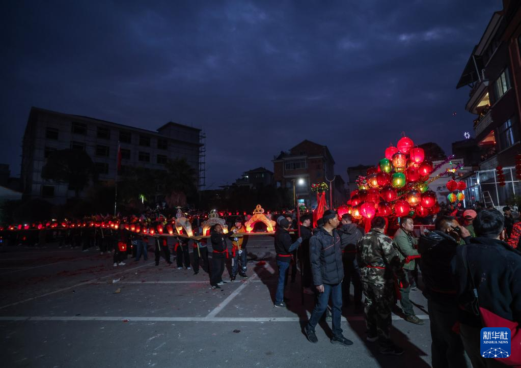 當日(ri)是(shi)農歷正(zheng)月十三,浙(zhe)江(jiang)省(sheng)金(jin)華市金(jin)東區赤松鎮虎巖村(cun)(cun)村(cun)(cun)民(min)肩扛(kang)由(you)100余節板(ban)凳組成的(de)(de)傳統(tong)五(wu)彩(cai)龍燈,沿村(cun)(cun)道蜿(wan)蜒游(you)舞(wu)(wu)。板(ban)凳龍的(de)(de)龍頭被彩(cai)燈包裹,裝飾(shi)有花卉、祥(xiang)云等圖案,在燭光(guang)搖曳間營造出“龍騰盛世”的(de)(de)年俗(su)畫卷。每年元(yuan)宵(xiao)節前后(hou),浙(zhe)江(jiang)省(sheng)金(jin)華市金(jin)東區赤松鎮的(de)(de)各村(cun)(cun)村(cun)(cun)民(min)都(dou)會舞(wu)(wu)起板(ban)凳龍燈,祈求來年風調雨順(shun)、五(wu)谷豐登(deng)。
