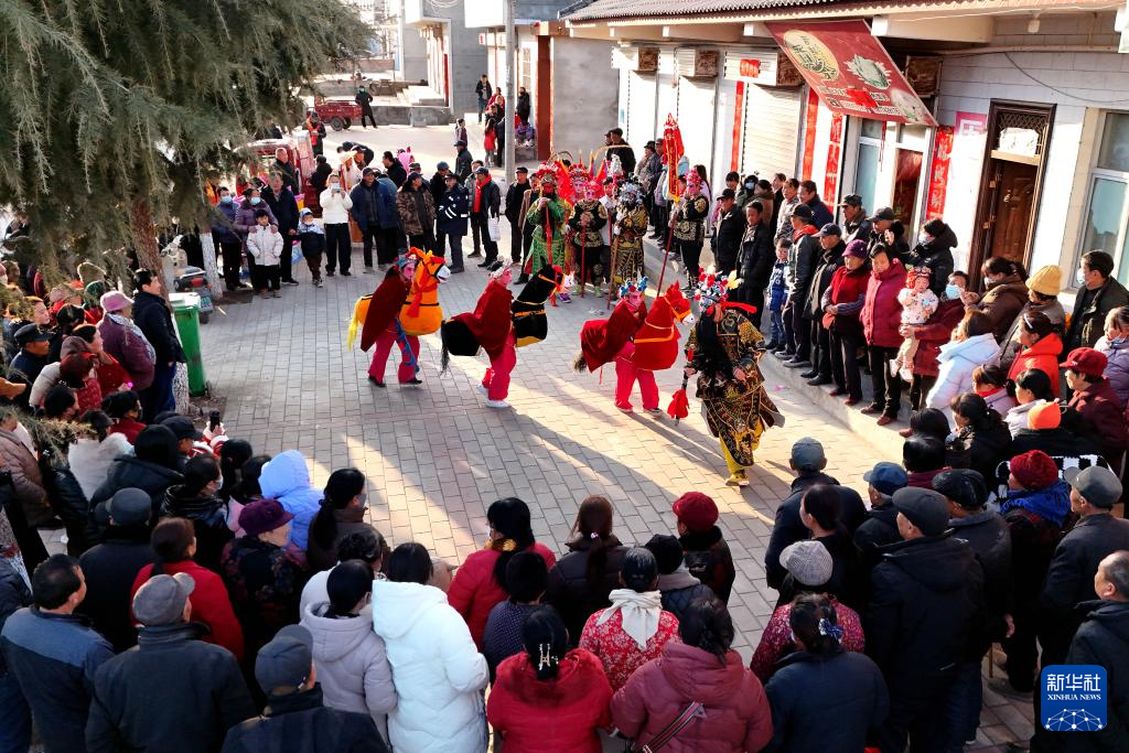 2月9日,隴縣曹家灣鎮(zhen)流渠村(cun)社火隊(dui)在(zai)隴縣曹家灣鎮(zhen)三里營村(cun)進行(xing)游演(無人機照片)。