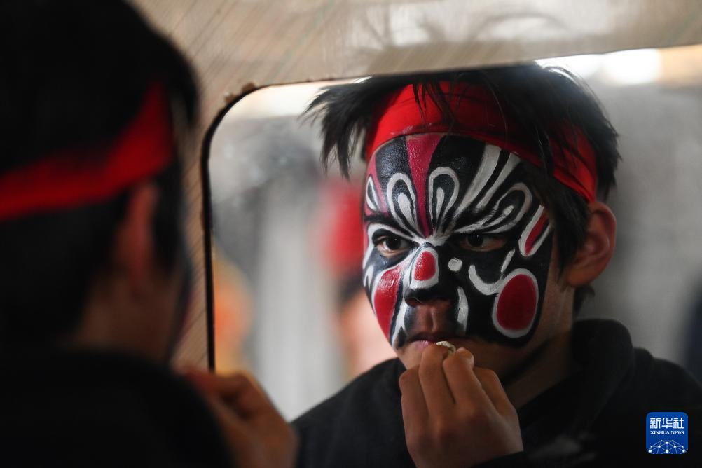 2月9日,隴縣曹家(jia)灣鎮流渠村社(she)火隊的少(shao)年在檢查(cha)自己的社(she)火臉譜。