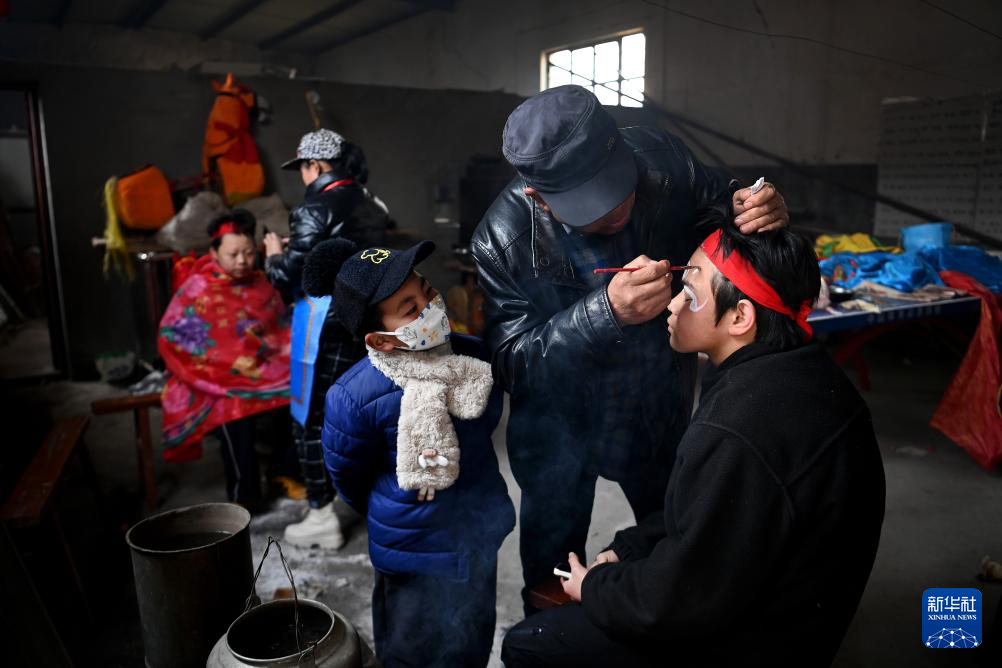 2月9日,隴縣曹家灣鎮流渠村的(de)村民(min)為社火隊的(de)孩子們繪制社火臉譜。