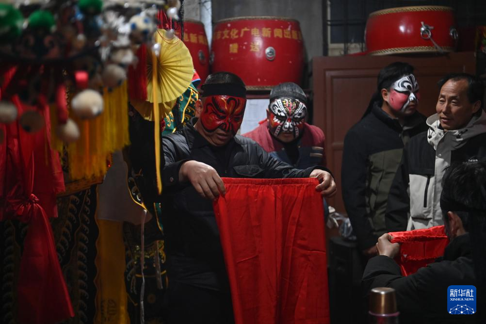 2月11日凌晨,黃花峪村社火隊成員(yuan)在整理演出服飾。