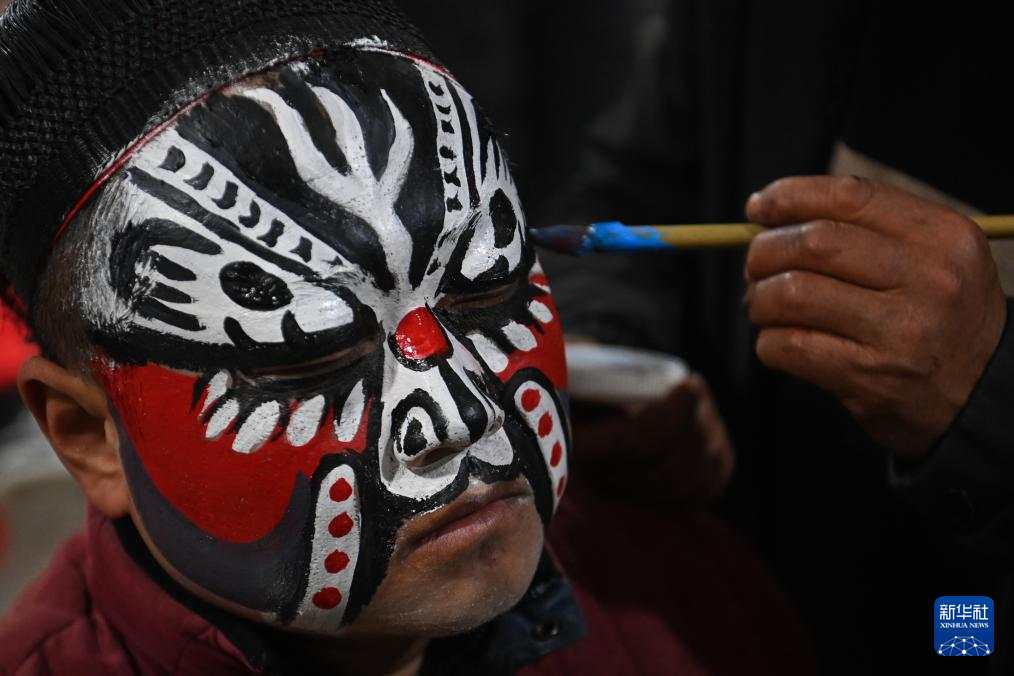 2月11日(ri)凌晨,黃(huang)花峪村的臉(lian)譜手藝人為社火隊成員繪制(zhi)臉(lian)譜。