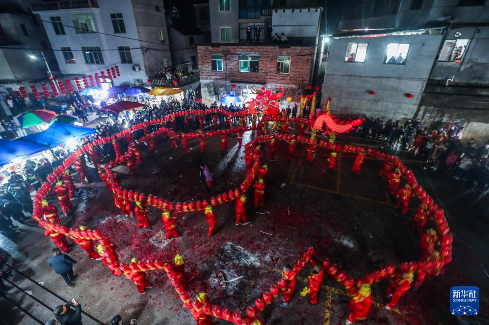 2月15日(ri),大墅鎮儒洪村村民們舉(ju)行“趕(gan)十八”舞龍表演(yan)。