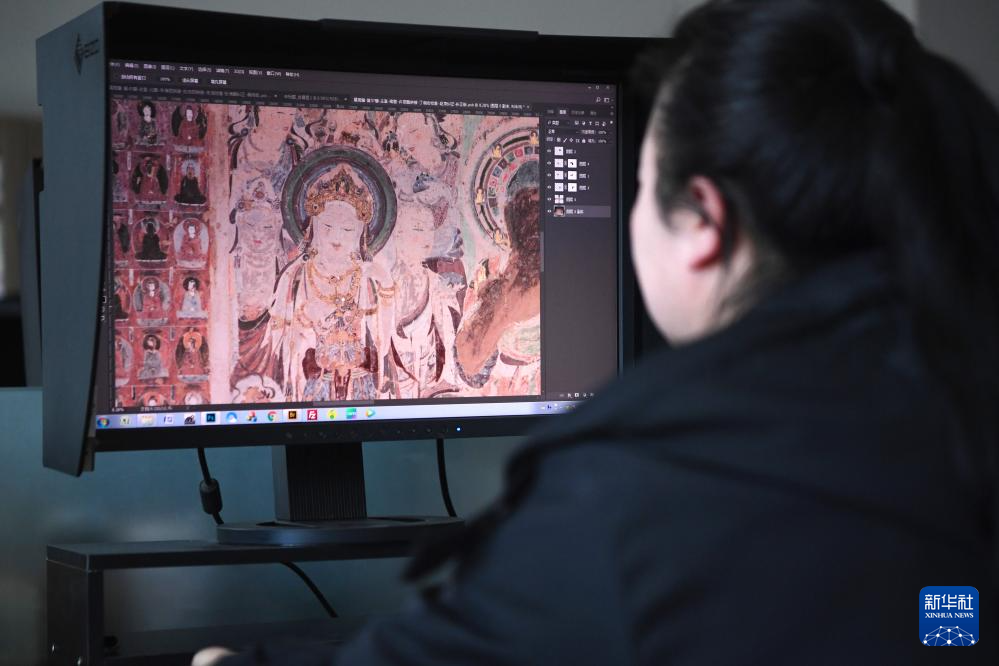 2023年(nian)4月25日(ri),敦煌研究院(yuan)文物數字(zi)化保護團隊圖像處理人員年(nian)海麗在拼接壁畫圖像。