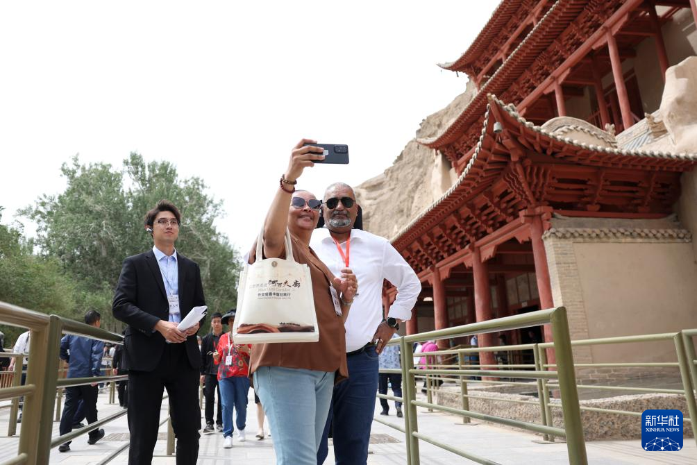 2024年(nian)6月7日,前來甘(gan)肅調(diao)研考察(cha)的駐華外交(jiao)官在敦煌莫高窟九層樓(lou)前留(liu)影(ying)。