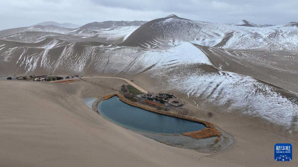 這(zhe)是2014年11月23日(ri)拍攝(she)的敦煌市鳴沙山月牙泉(quan)景區雪(xue)景(無人機(ji)照片)。