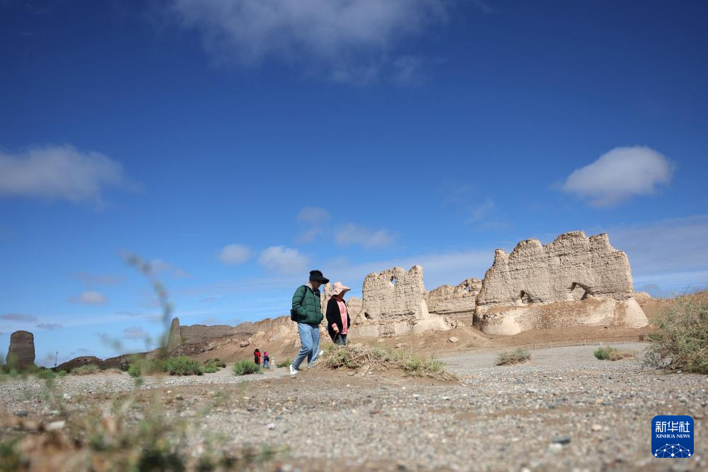 2024年9月4日,游(you)客在(zai)雨后的玉門(men)關遺址區大方(fang)盤城游(you)覽。