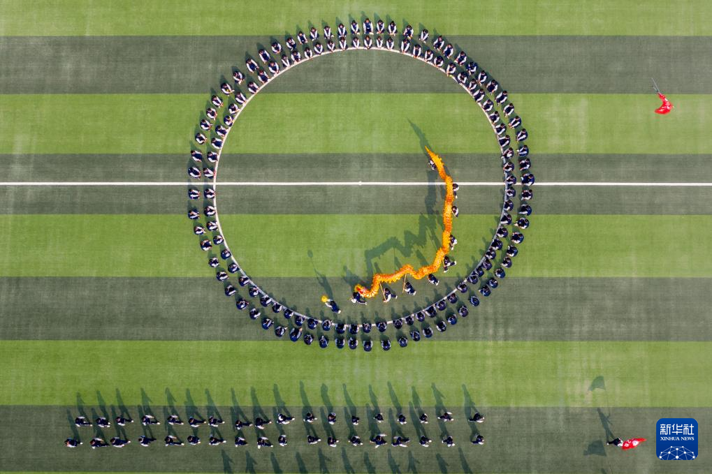2月28日,山東省淄博科技學校龍獅社團的學生在操場上舞龍(無人機照片)。