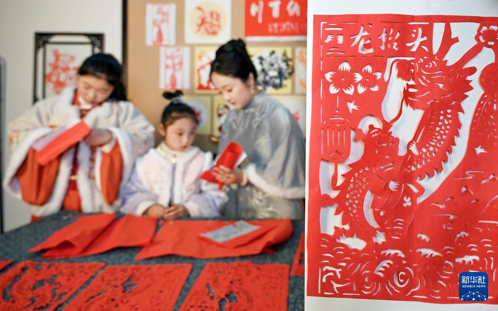 3月1日,在安徽省宿州市碭山縣碭城鎮土山社區,剪紙技藝傳承人和小朋友一起剪春龍。