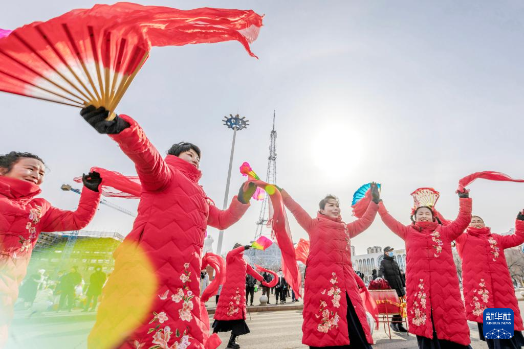 3月1日,市民在黑龍江省齊齊哈爾市工人文化宮廣場扭秧歌。