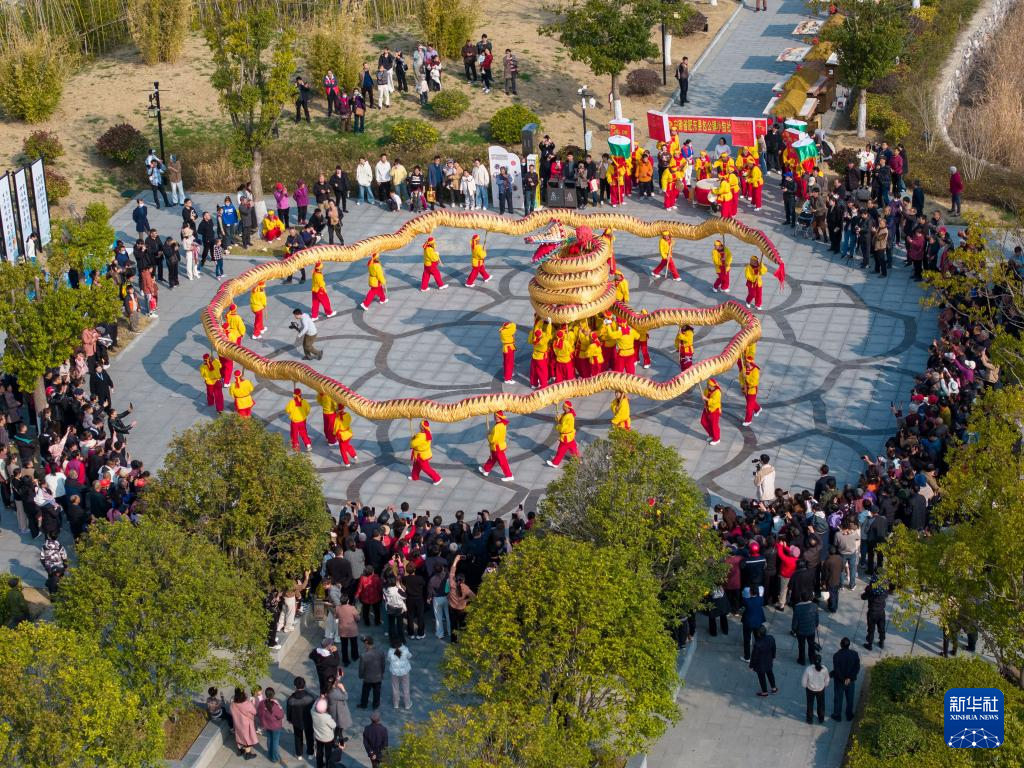 3月1日,在安徽省合肥市肥東縣包公鎮,當地居民開展“肥東洋蛇燈”民俗活動(無人機照片)。