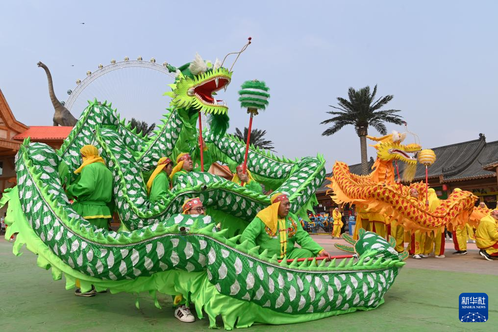 3月1日,在河南省沁陽市懷府恐龍園,一支民間舞龍隊進行舞龍表演。