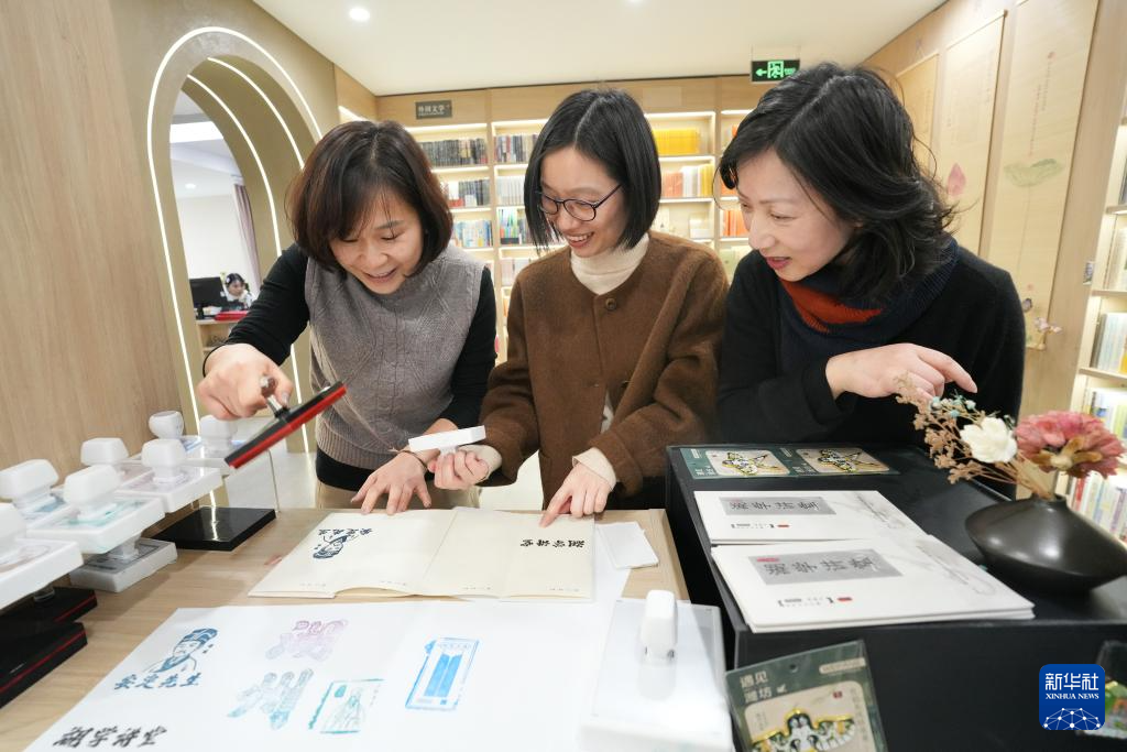 3月5日,在位于吳興區愛山街道的湖州三聯書店,市民在體驗湖學系列文創產品。