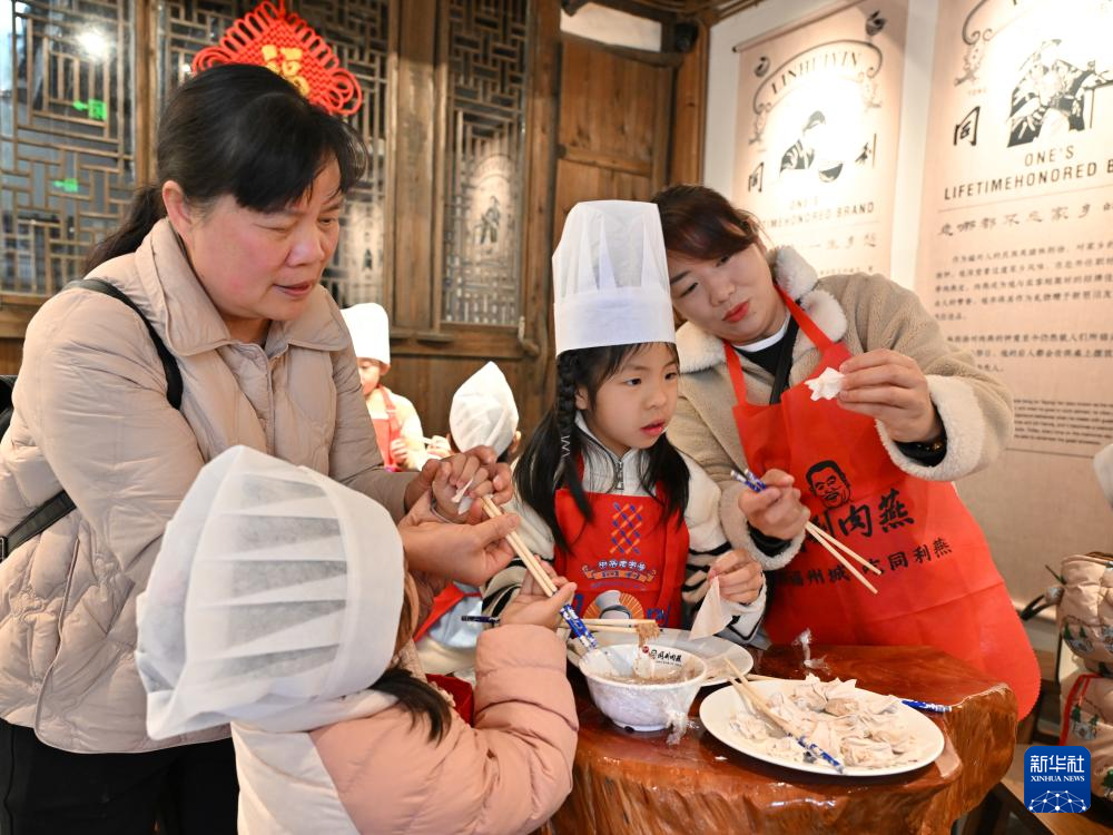 3月8日,在福州三坊七巷同利肉燕非遺文化體驗館內,家長與小朋友共同包肉燕。
