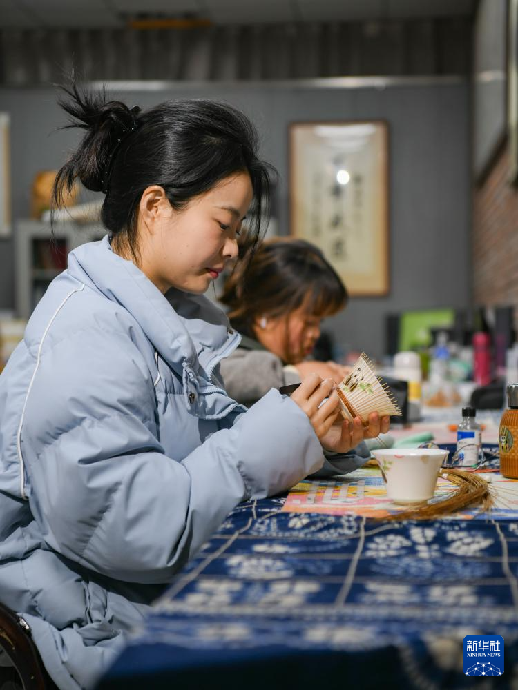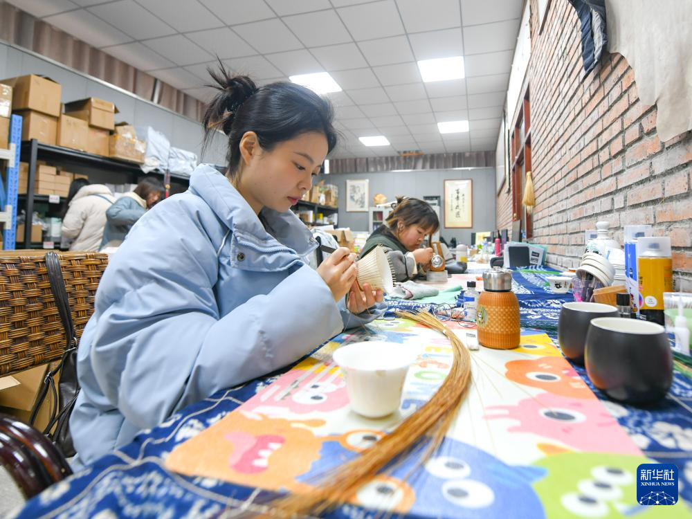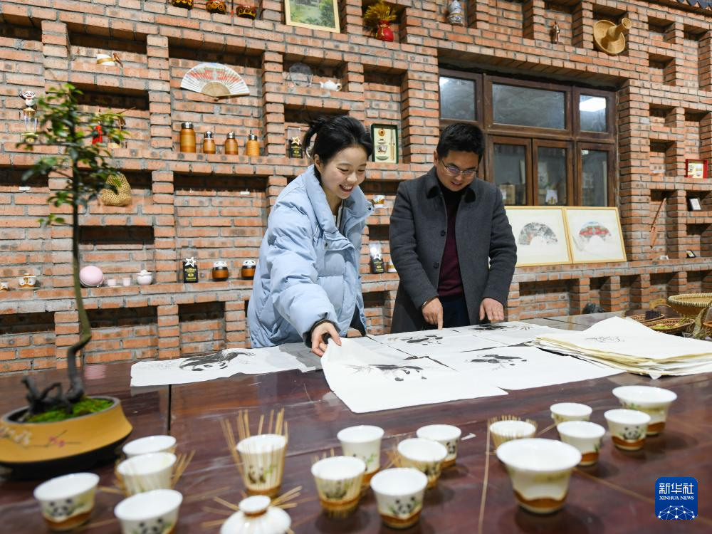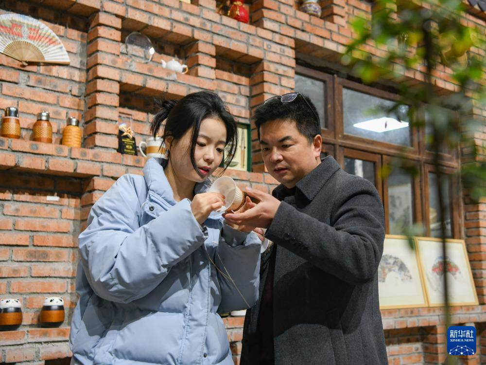 在崇州市朱利原鄉非遺文化園,白靜波和女兒白梓憶在查看編制中的“熊貓抱竹”蓋碗茶杯細節(3月7日攝)。