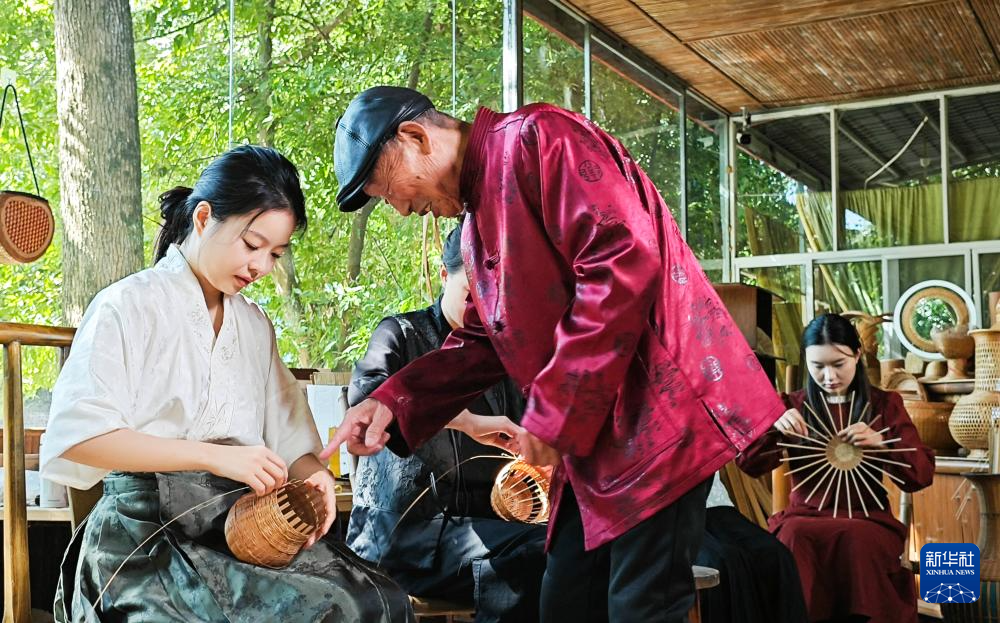 道明竹編國家級非遺代表性傳承人趙思進(左二)在指導白梓憶(左一)編制竹罐(2024年10月27日攝)。