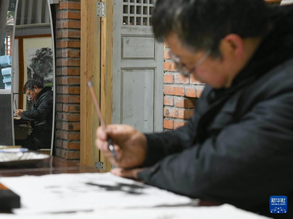 崇州皮影戲非物質文化遺產傳承人楊勇在繪制“熊貓抱竹”設計草圖(3月6日攝)。
