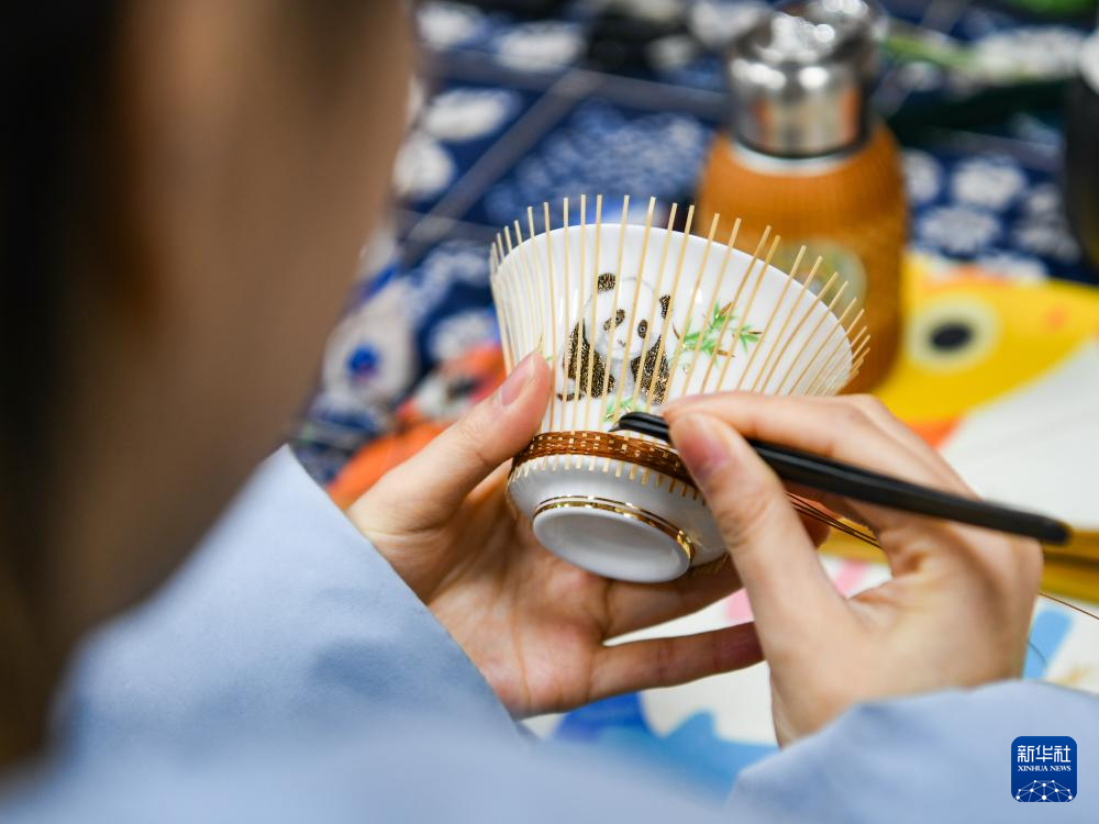 白梓憶在編制“熊貓抱竹”蓋碗茶杯(3月7日攝)。