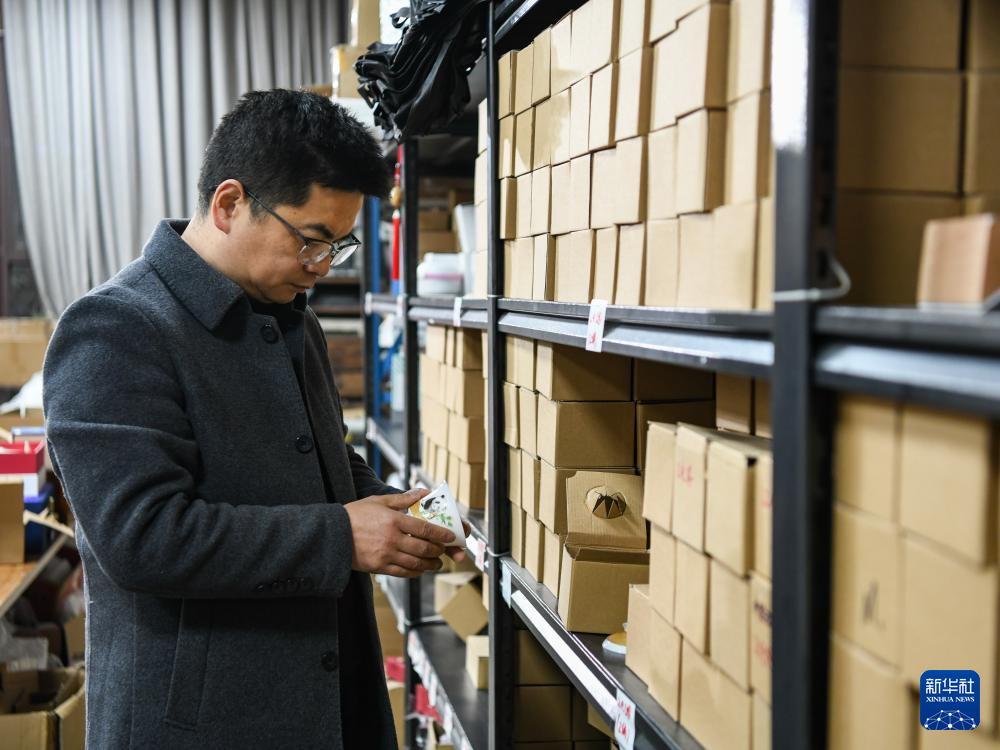 白靜波在庫房查看即將入庫的“熊貓抱竹”蓋碗茶杯成品(3月7日攝)。
