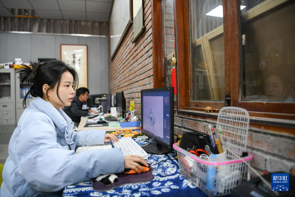 白梓憶(前)在電腦上設計完善熊貓文創形象細節(3月7日攝)。