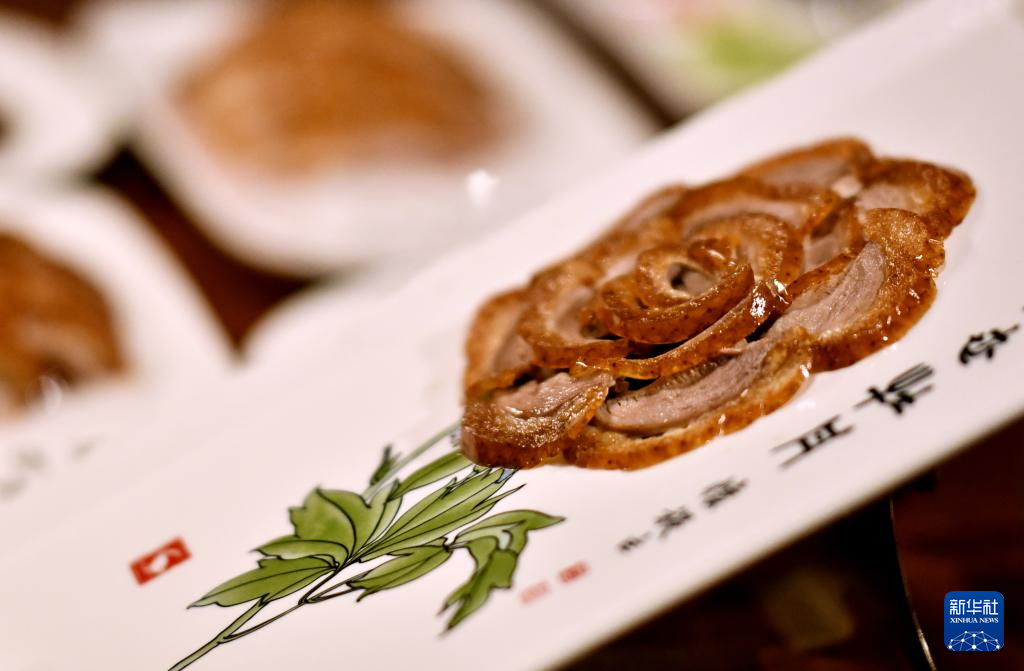 片切擺放好的全聚德掛爐烤鴨(3月13日攝)。