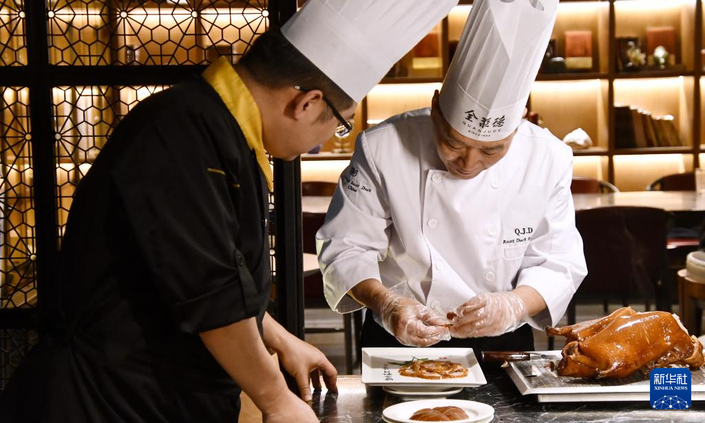 全聚德掛爐烤鴨第六代傳承人、高級烹飪技師吳玉波(右)在為學生傳授經驗(3月13日攝)。