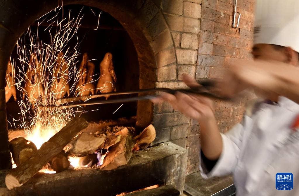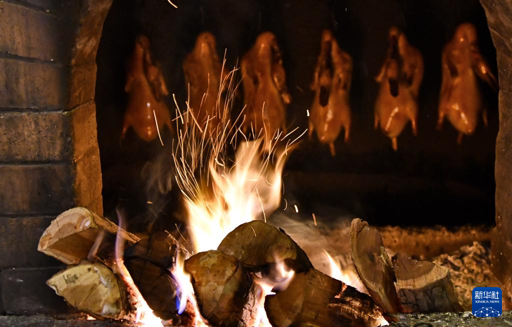 在全聚德烤鴨店和平門總店的傳統掛爐中烤制的烤鴨(3月13日攝)。