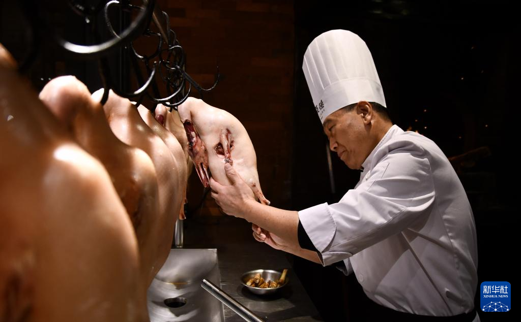 全聚德掛爐烤鴨第六代傳承人、高級烹飪技師吳玉波在展示掛爐烤鴨技藝(3月13日攝)。