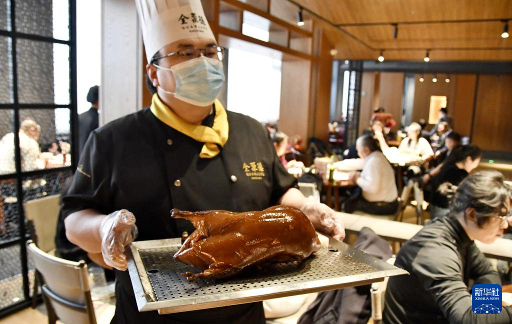 顧客在全聚德烤鴨店和平門總店品嘗掛爐烤鴨(3月13日攝)。