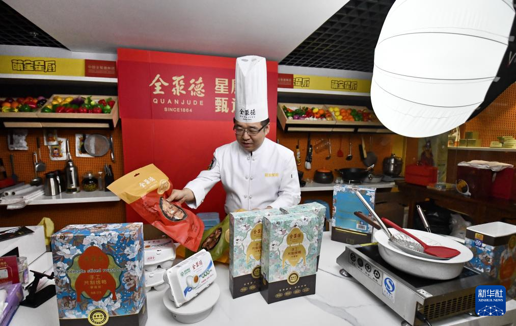 全聚德烤鴨店的年輕技師準備進行網絡直播銷售(3月13日攝)。