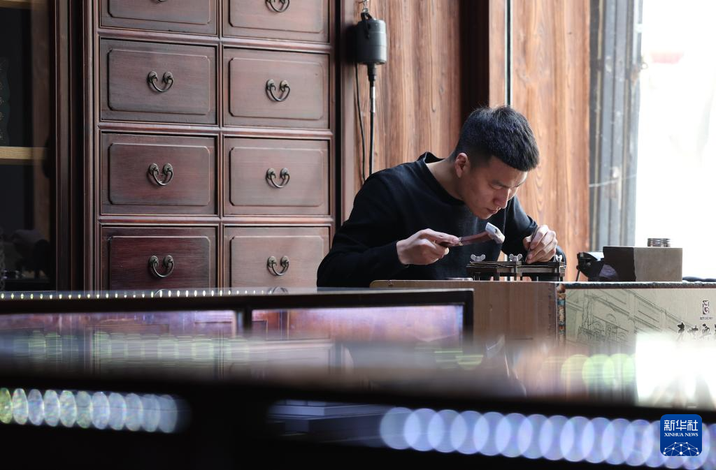 在遼寧省營口市遼河老街百年建筑老世興銀樓工坊里,作為遼寧省非遺代表性項目老世興金銀制作技藝第六代傳承人的孫朋,忙著對銀飾進行鏨刻加工。