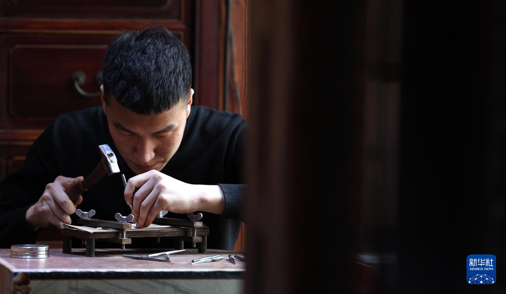 3月11日,孫朋對制作的銀飾進行鏨刻。