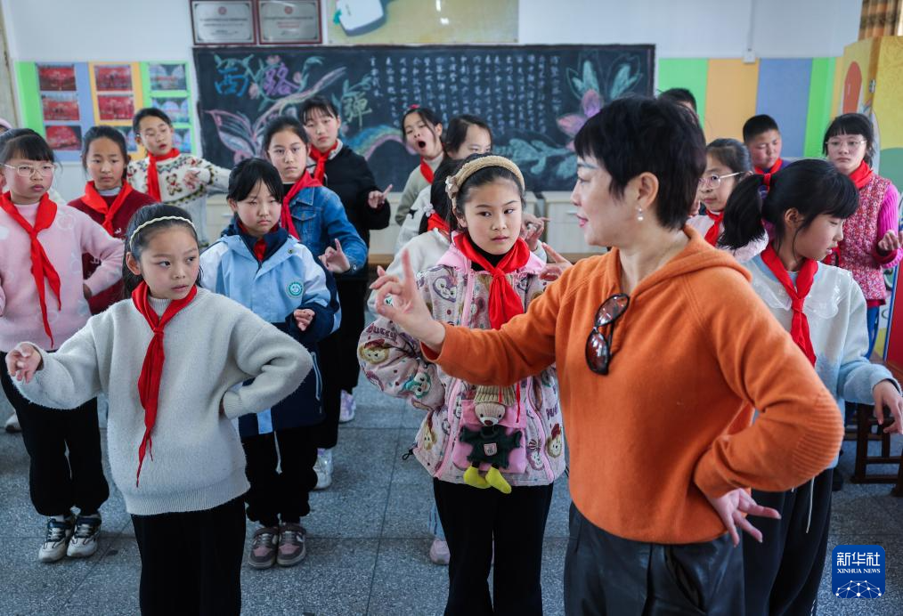 3月18日,東和鄉小學西路亂彈傳承特色班的學生在東和鄉十里坪村文化特派員卓秋萍(中)的指導下學習西路亂彈的表演動作。