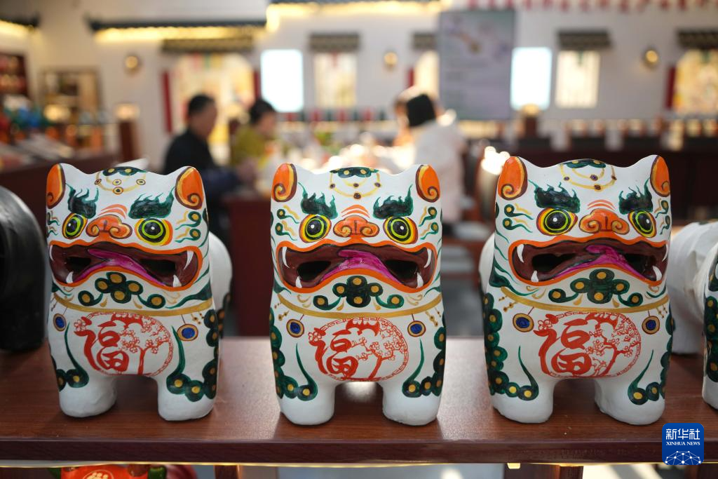 3月19日拍攝的姜莊鎮的一家工坊內陳列的泥老虎產品。