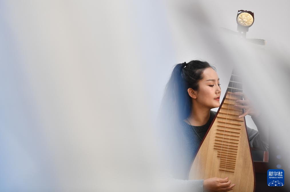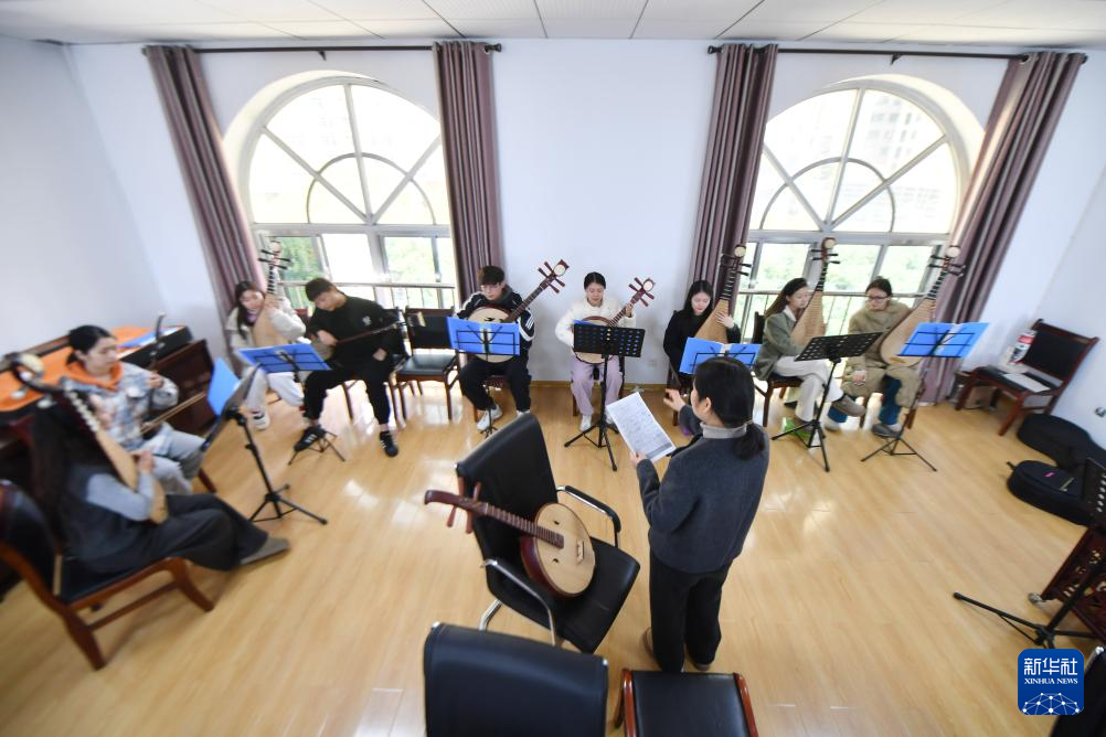 3月18日,常德絲弦藝術劇院的青年演員在練習絲弦樂器。