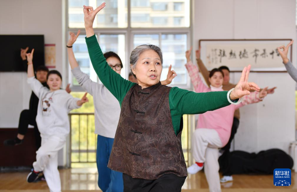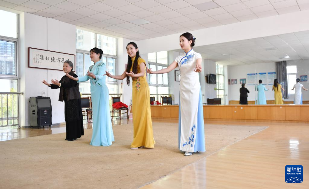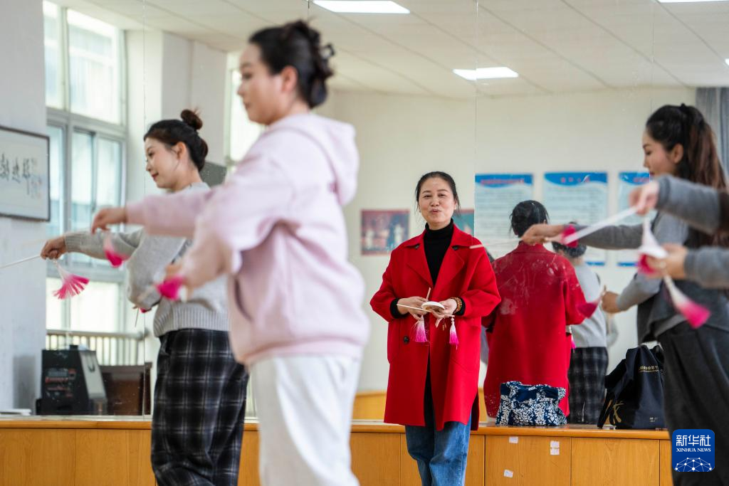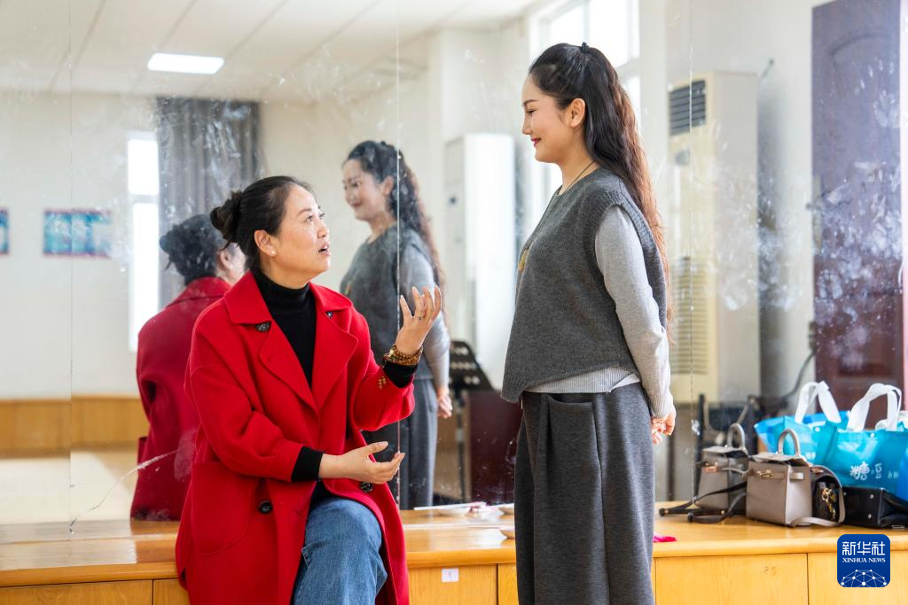 3月17日,“60后”的常德絲弦代表性傳承人朱曉玲(左三)在指導青年演員練功。