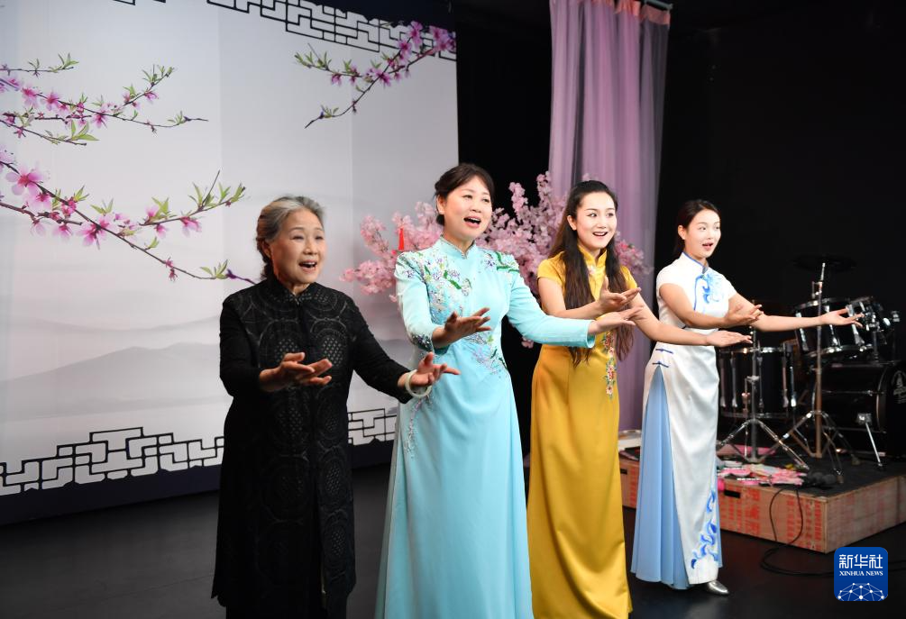 3月19日,“50后”的常德絲弦名家宋潔(左一)、“60后”的常德絲弦代表性傳承人朱曉玲(左二)、“80后”的常德絲弦青年傳承人伍恩禹(右二)與“90后”青年演員代表謝顏竹(右一)四代曲藝人共同排練曲目。