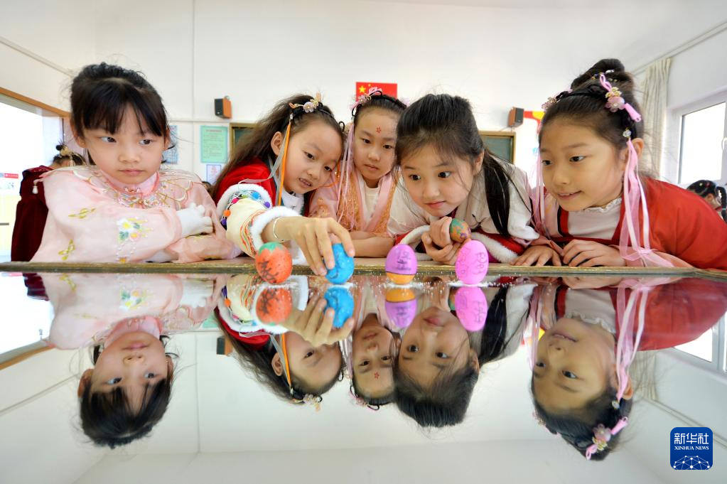 3月20日,學生們在山東青島市實驗小學開展的“傳統習俗迎春分”主題活動中進行豎蛋游戲。